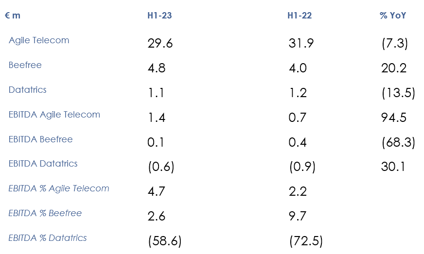 Agile Telecon e Bee sono le business unit maggiormente profittevoli, qui di seguito la tabella del primo semestre con fatturato di Agile, Bee e Datatrix: